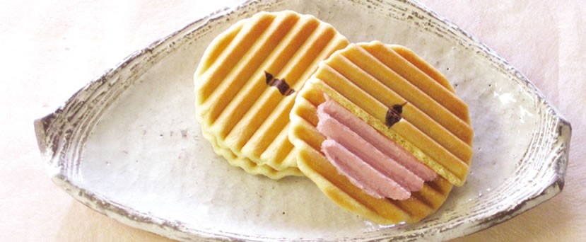 欧風菓せんべいヴァッフェル。 甘酸っぱい風味の苺クリームを、フレッシュバターを使用し さっくりと焼いたヴァッフェルに挟んで仕上げました。