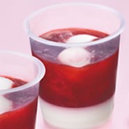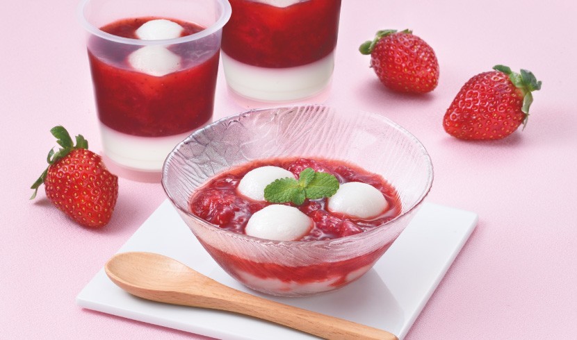 甘みを抑えた練乳寒天の上に程良い酸味の特製苺ソースをたっぷりとかけました。